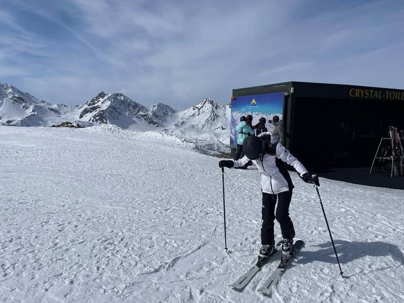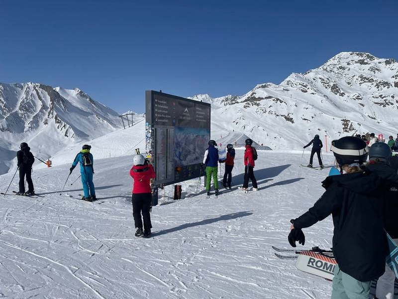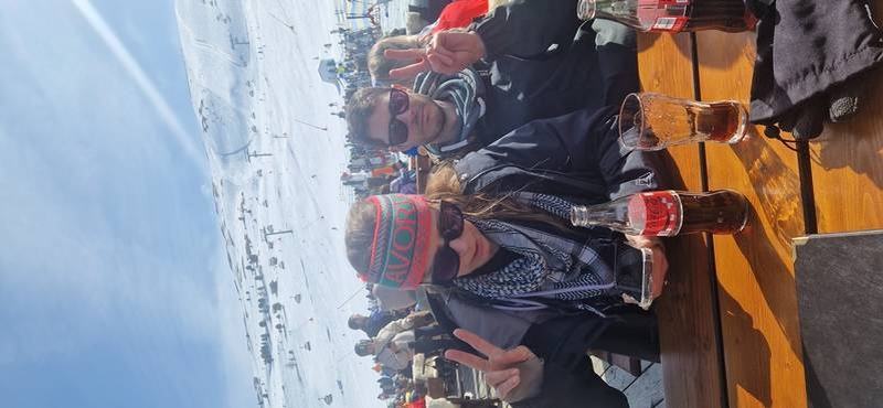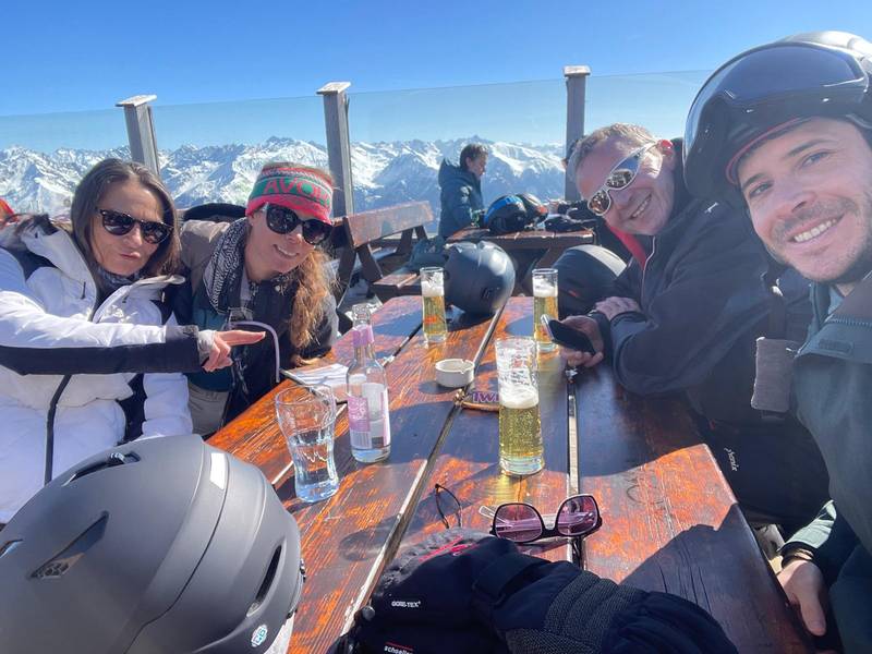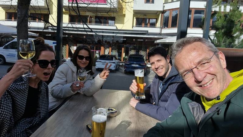 jost und sandra hingegen wollten nochmals wissen, ob man die pisten auch wirklich bis zum bitteren ende nutzen kann. spoiler: kann man. also nochmals ein paar flotte schwünge und etwas tempo, bis auch bei uns die apero-sehnsucht stärker wurde als die oberschenkel. zurück am tisch war die lage wie erwartet: ado und edith bereits bestens akklimatisiert, gläser halb leer (oder halb voll…) und mit wichtigen zwischenresultaten aus der apero-vorbereitung.